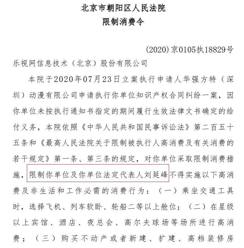 上述限制消费令显示,北京市朝阳区人民法院于2020年7月23日立案执行申请人华强方特(深圳)动漫有限公司申请执行乐视网知识产权合同纠纷一案,因乐视网未按执行通知书指定的期间履行生效法律文书确定的给付义务,对乐视网及其法定代表人刘延峰采取限制消费措施。