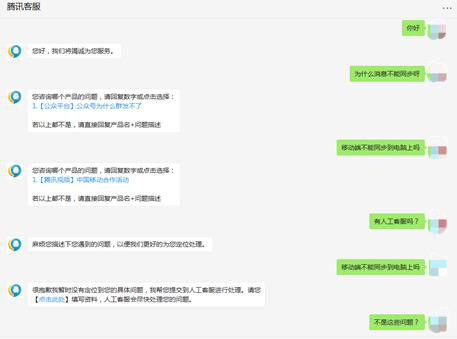 此后,记者进入腾讯官网,在腾讯客服页面进行问题咨询,但也只有机器人客服能及时回复。记者虽然多次尝试拨打人工客服电话,最终也未能打通电话联系上人工客服沟通,而机器人客服提供的解决方案,并未能解决记者提出的疑问。