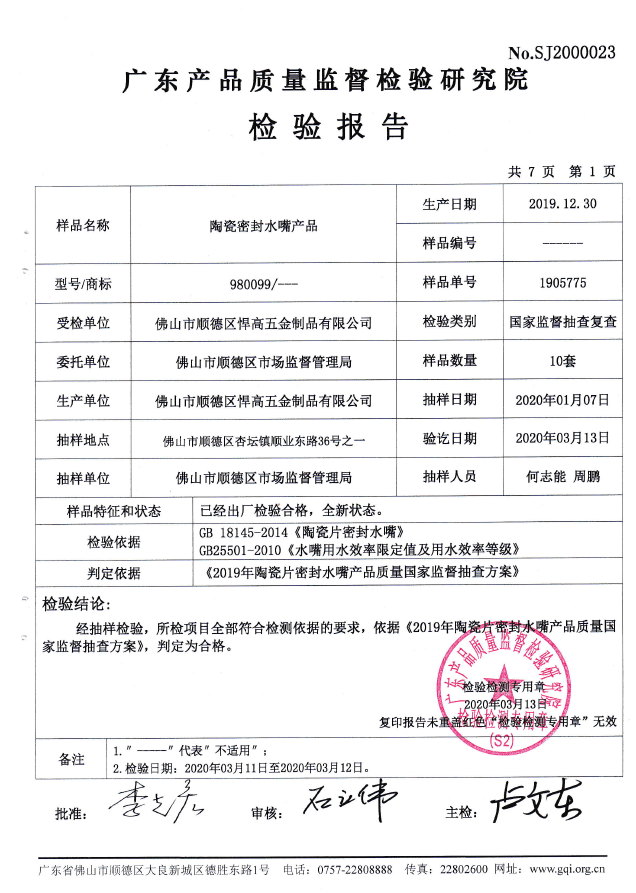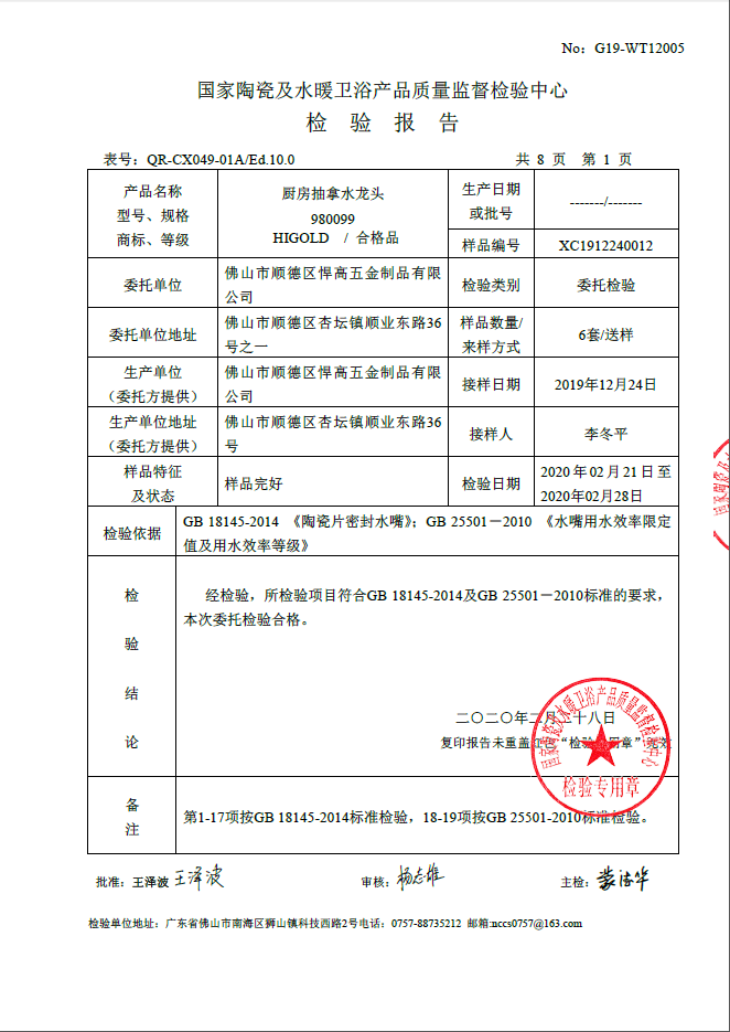 最新消息,悍高五金旗下厨房抽拉龙头产品(产品型号980099)于2020年初多次接受国家级抽查检测,抽查结果为全部产品合格。(下附检验报告)