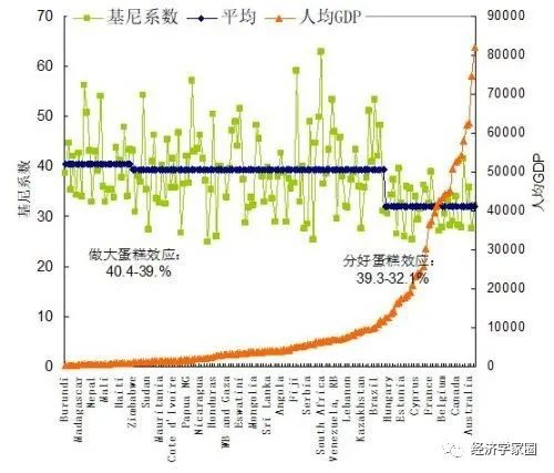 从图7中可以看到,波动的曲线是不同国家的基尼系数,这些国家的排列方式是按人均GDP从低到高进行的。