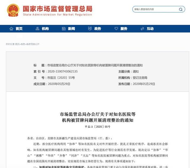 通知称:近期,部分医疗机构利用“协和”等知名医院名义对外开展经营,扰乱正常医疗秩序,造成恶劣社会影响。知名机构被冒牌问题在其他领域也时有发生。为促进医疗等行业规范有序发展,现决定以“协和”“华山”“湘雅”“华西”“齐鲁”“同济”“天坛”等知名医院被冒牌问题为重点,对知名医院等机构被冒牌问题在全国范围内开展清理整治,切实规范市场主体经营行为。