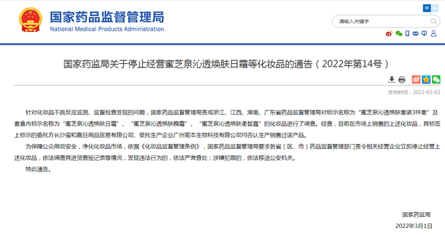 国家药监局发布关于停止经营蜜芝泉沁透焕肤日霜等化妆品的通告。