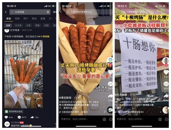 近日,在短视频平台上,“10根烤肠的仪式感”火了,不少女生晒出男友给自己买的“10根烤肠”,火爆程度堪比“秋天的第一杯奶茶”