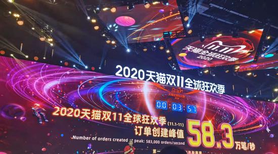 天猫实时数据显示,2020年天猫双11全球狂欢季(11 1-11 11)订单创建峰值58 3万笔 秒。而2019年双11当天,突破100亿元用时1分36秒