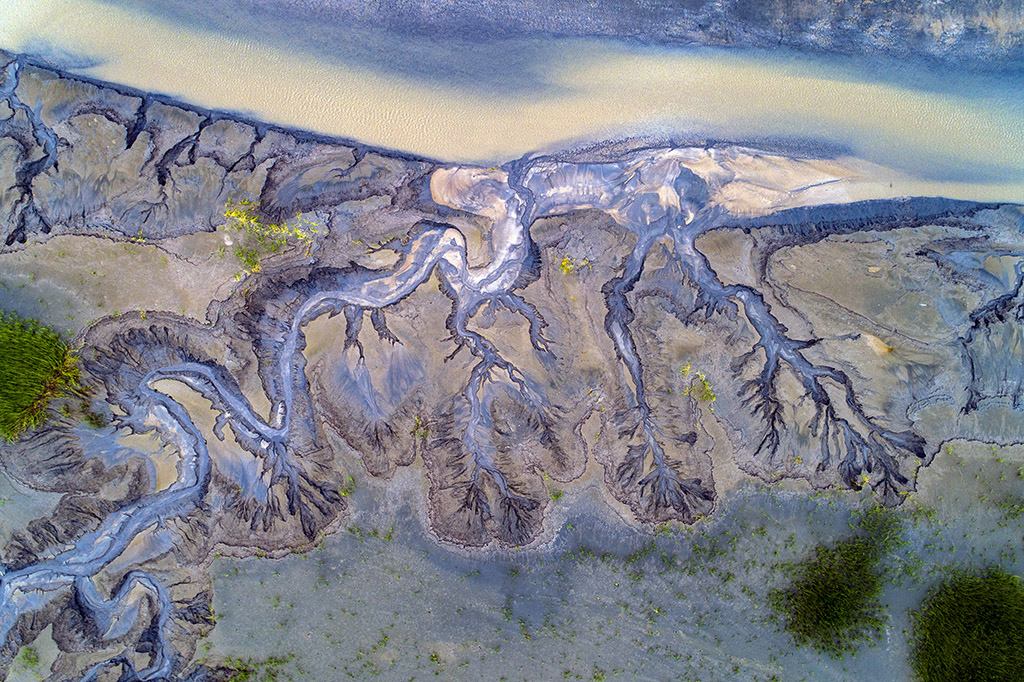 2020年8月29日,江苏省南通市如东县小洋口海涂湿地,由潮汐形成的海涂湿地自然纹理如一幅幅创意画。湿地保护区加大自然生态修复,数千亩的大米草与潮汐形成的纹理构成一幅幅完美的画卷