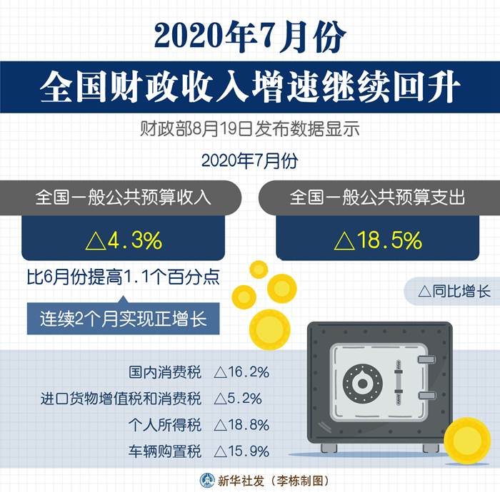 财政部19日发布数据显示,7月份,全国一般公共预算收入同比增速达4 3%,比6月份提高1 1个百分点,连续2个月实现正增长