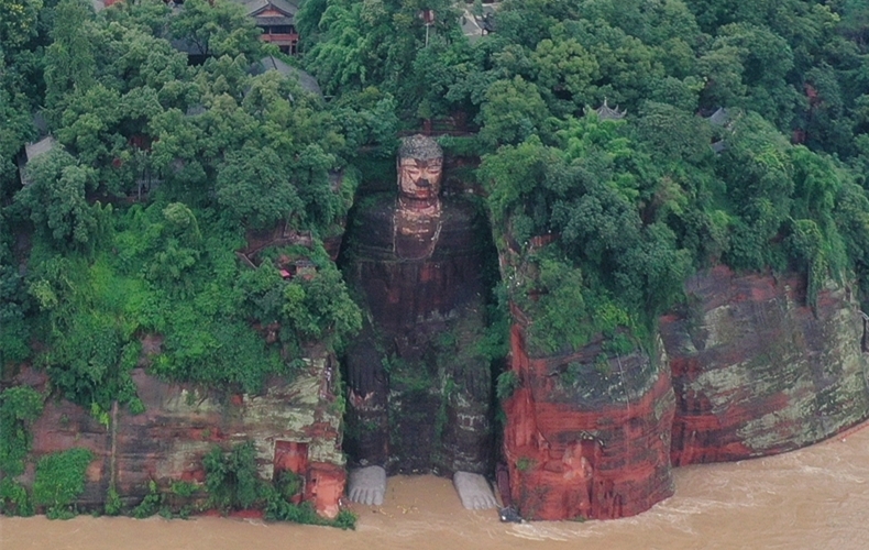 航拍洪水中的乐山大佛:大水已漫过佛脚