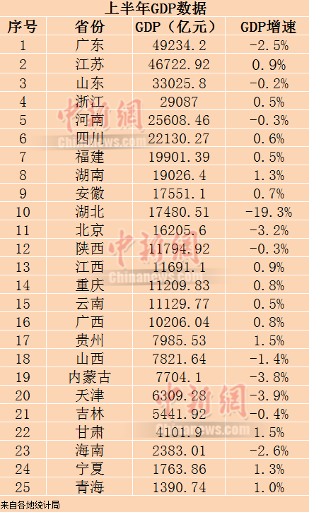 截至7月21日,全国至少已有25个省区市发布了2020年上半年经济数据。其中,14个省份经济增长实现由负转正