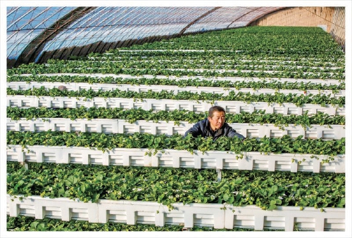 在山西省晋中市太谷县现代农业产业园首创的旱垣温室大棚内,向荒山“要来的土地”覆盖着生机盎然的绿色蔬菜,与棚外的一片贫瘠形成了鲜明的对比