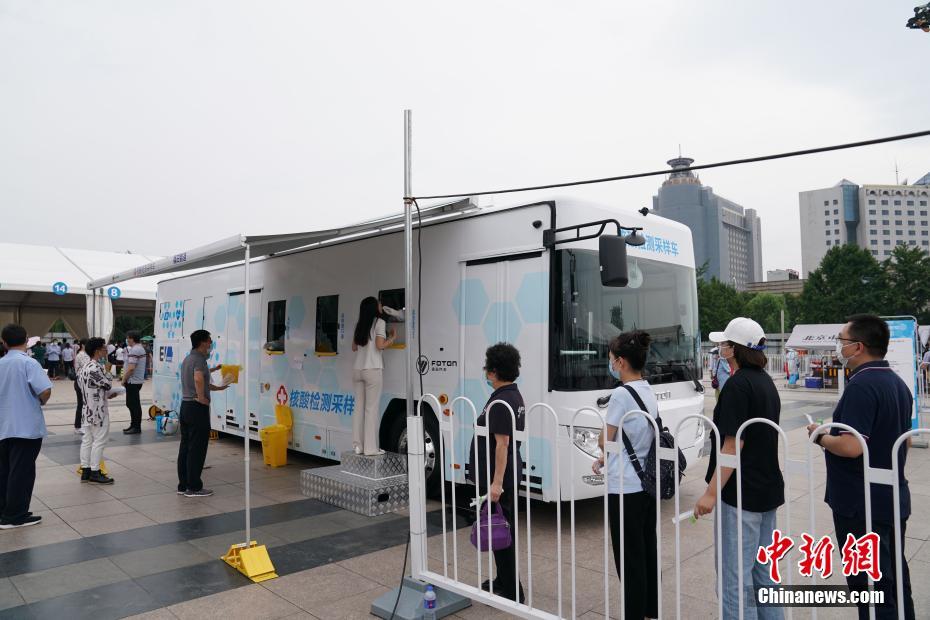 6月28日,一辆核酸检测采样车在北京北展广场核酸检测点投入使用,市民排队检测
