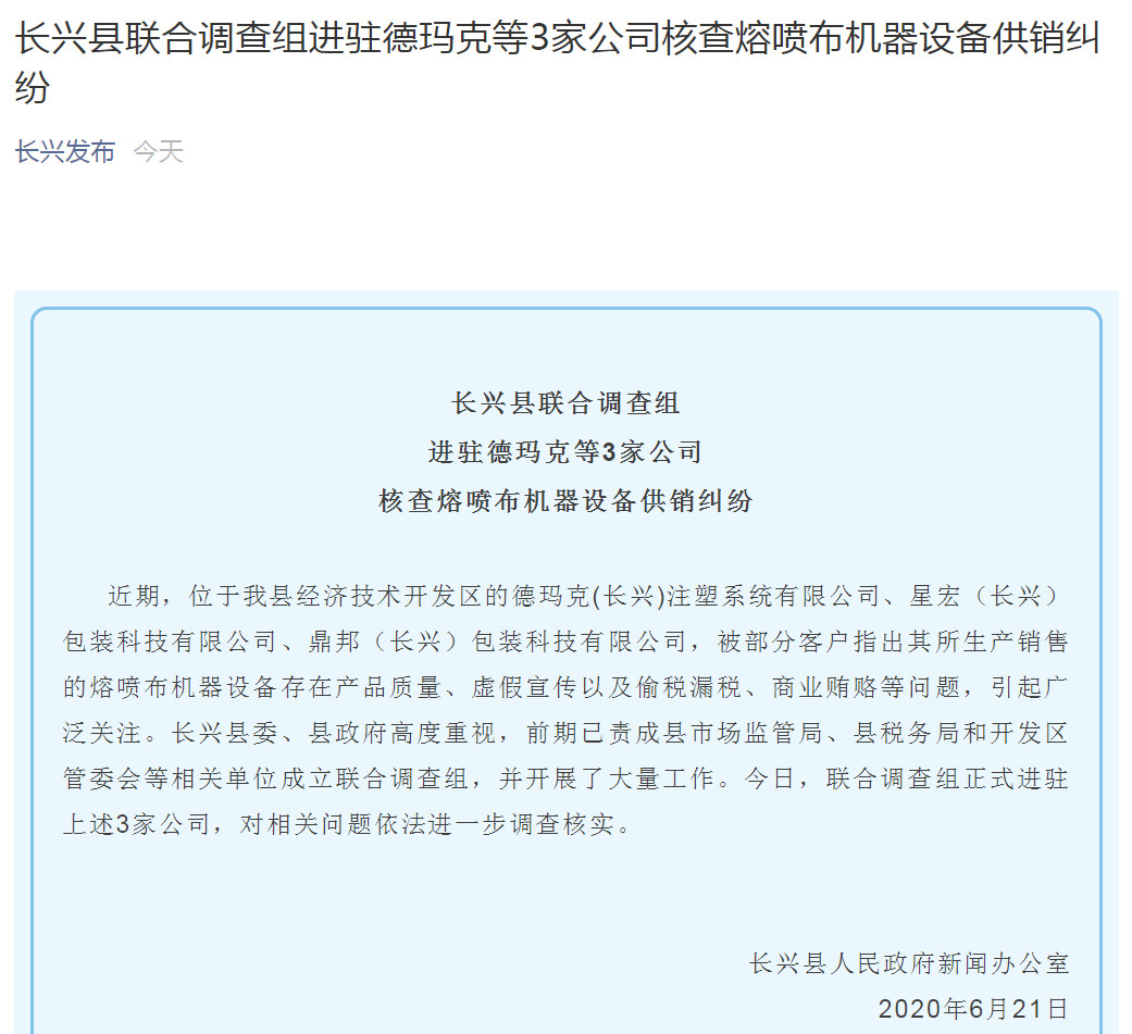 浙江省长兴县人民政府新闻办公室21日发布公告称,长兴县联合调查组进驻德玛克等3家公司核查熔喷布机器设备供销纠纷